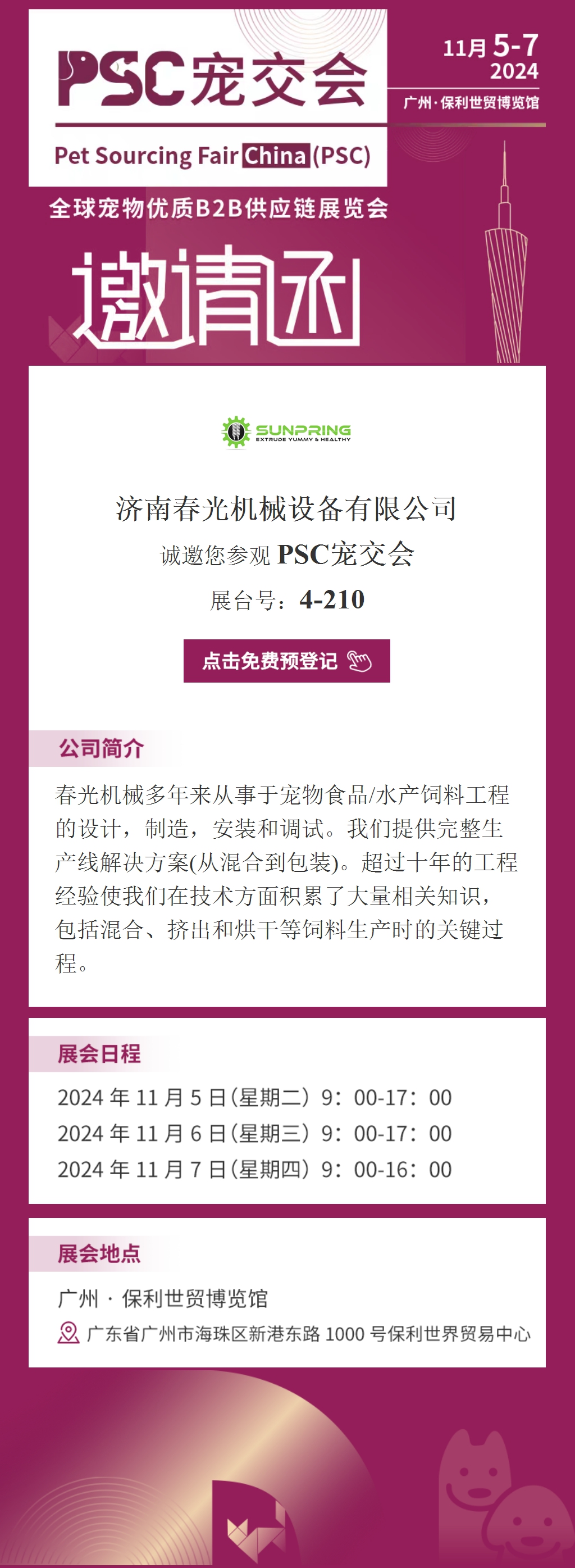 您現(xiàn)在的位置:首頁(yè)> 新聞中心 > 新聞中心 >> 展會(huì)信息 >> 濟(jì)南春光機(jī)械設(shè)備有限公司 誠(chéng)邀您參觀 PSC寵交會(huì)