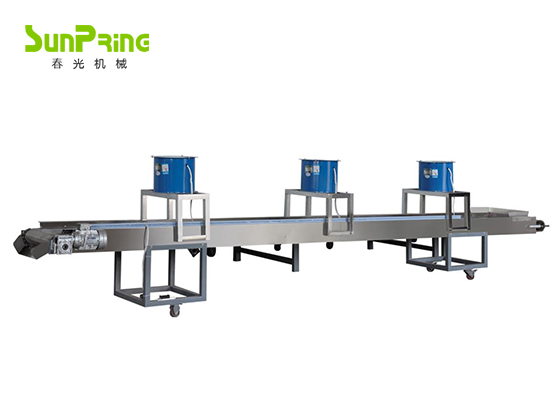 通過(guò)震動(dòng)使得玉米片在進(jìn)入高溫烤箱的時(shí)候均勻排列在網(wǎng)帶上,避免堆積...